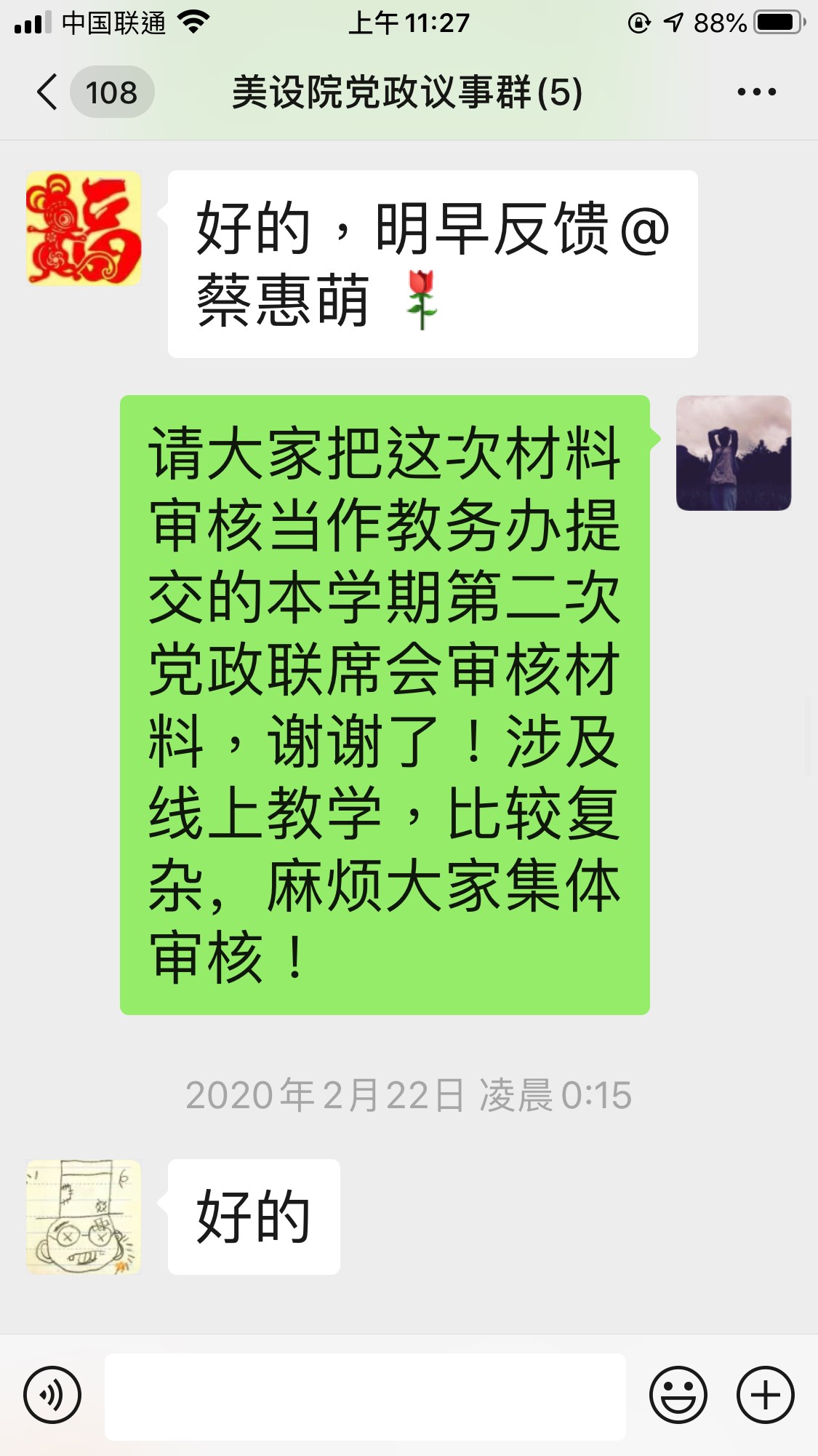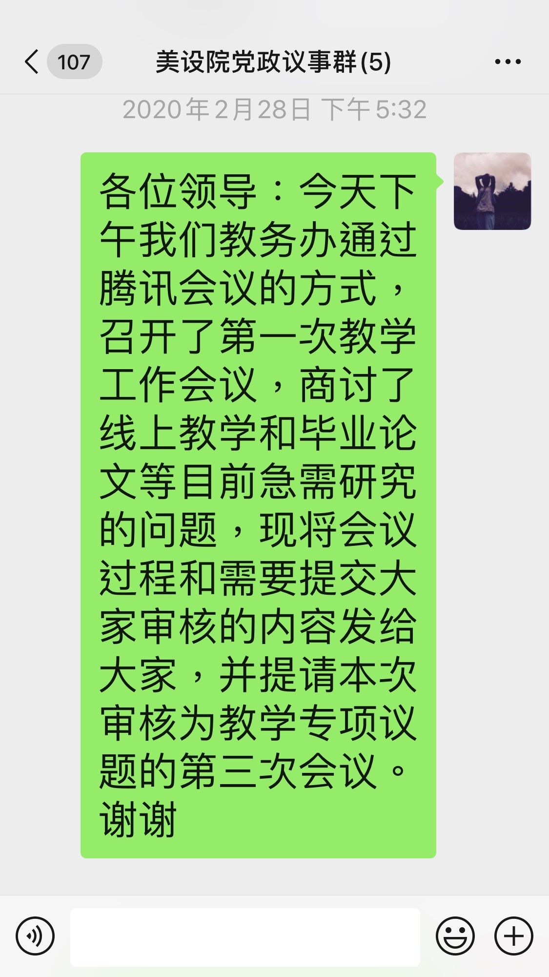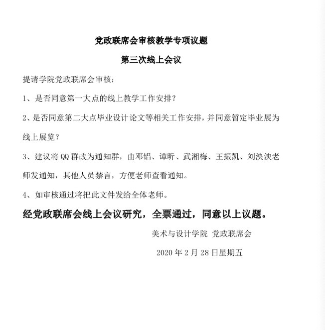 2020年2月15日至3月6日,bevictor伟德官网分别在线上召开四次教学专项党政联席会议,审议教学负责人提交了《bevictor伟德官网疫情防控期间在线教学与组织管理工作方案》、《bevictor伟德官网教师线上教学实施与课程建设一览表》、《bevictor伟德官网线上教学督导计划》等文件,明确“以课程组为单位,教学方式灵活多样,平台选择以简单易操作,保障教学为主”的工作思路。审定了全院教师、所有课程的线上教学初步计划,选用平台情况等。要求课程组内统一教学方式,课程组负责人负责填报实施情况,相同课程同平台上课,同头课教团队源互享,协同工作模式。确定了开学前试课工作安排;线上教学督导方案;教学材料要求;毕业论文实施方法;毕业作品展的调整等。从宏观到微观,层层细化,逐步落实了公司线上教学的具体工作,为公司线上教学的顺利实施奠定了基础。
