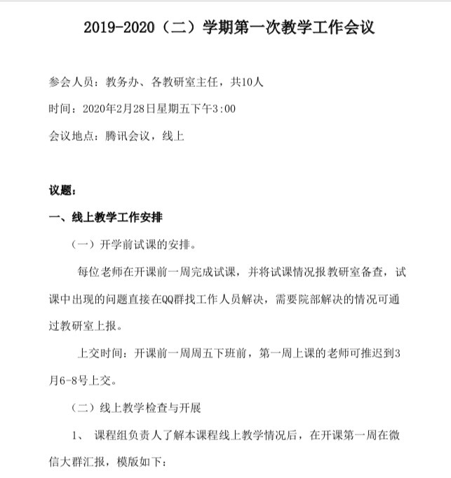 根据《bevictor伟德官网疫情防控期间在线教学与组织管理工作方案》等文件的相关要求,院教务办多次召开小型会议,商讨线上教学的实施细节。在教科办主任谭昕老师的细心组织之下,线上教学各项工作有条不紊,顺利开展,教科办其他老师尽职尽责,确保公司各项工作有序开展,高效完成。2月28日下午,本学期第一次线上教学工作会议,在腾讯会议室的云上办公地点,各教研室主任、教务办全体老师进行了热烈的讨论,对线上教学工作的实施细节、近期各部门各项工作等进行深入交流。将形成的提案交公司党政联席会审核,最终形成文件发到公司微信群,让每一位老师清楚地知晓线上教学工作开展的细节,并在公司网站刊发新闻稿。公司教务办严谨认真、高效细致的工作多次得到相关部门的表杨。