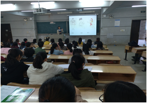 2015级美教702班的钟滢汐、702班的杨田玉、701班的周洁怡、702班的贺春瑞同学分别为大家展示了《变形的魅力》、《书包》、《花格子小牛》、《三个小伙伴》等课程。