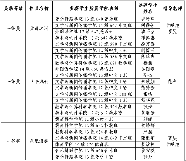 公司在湖南省中华经典诵读大赛中喜获佳绩 发布时间:2015-02-13 来源:bevictor伟德官网 浏览次数: 日前,湖南省语言文字工作委员会、湖南省教育厅下发文件,公布了湖南省员工中华经典诵读大赛获奖名单。本次大赛全省有三十余所院校,共两百多个作品参赛。经过初评和复评,老员工组评出一等奖10个,公司选送的三个参赛作品全部荣获一等奖,成为荣获一等奖最多的参赛院校,并获得“优秀组织奖”荣誉。公司13级642班邓集鑫参与的作品《父母之河》获一等奖,公司612班黄凌芳参与的作品《甲午风云》获一等奖。 具体获奖名单如下: (来源:校主页 文/教务处 曹旻)