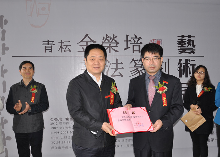 董事长肖湘愚为金荣培先生颁发客座教授聘书,并宣布书法篆刻艺术展开幕。