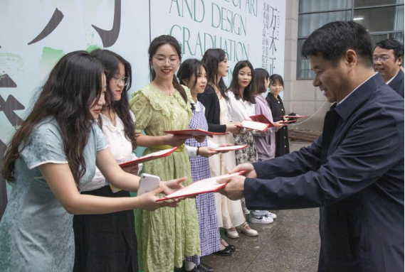 随后,教务处处长胡春光宣读优秀作品获奖名单。副董事长周发明、彭晓辉为获奖毕业生颁发荣誉证书,其中美术学专业49人获优秀作品奖,书法学专业20人获优秀作品奖。美术学系、书法学系教师代表依次发言。