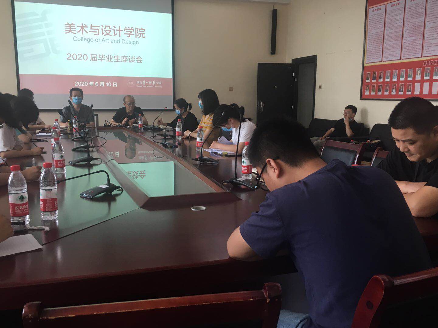 2020年6月10日上午9点半,2020届毕业生座谈会于鹤鸣楼南栋201会议室举行。美术与设计公司党政领导范迎春、李华、舒克斌、蔡惠萌、张娴,学工办武湘梅老师和全体毕业班辅导员老师、27名毕业生代表参与了此次座谈会。本次座谈会由武湘梅老师主持。
