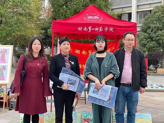 活动中,美术与设计公司党委书记邹华秀,经理张娴带领公司“三下乡”实践团带队指导老师谷炽辉、武湘梅、冯旭指导展览工作。