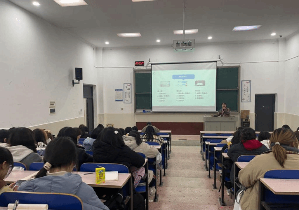 会议在全体师生热烈的掌声中正式开始。第一位主讲人龙君老师向会场内的老师及员工表示问候,言简意赅的对今天的讲座内容进行概括,简单介绍了四级考试各题型构成及分值、考试流程、听力理解题目构成、评分标准,并详细讲解了听力答题技巧、篇章翻译解题技巧。龙君老师的精彩演讲结束,同学们进行了五分钟的休整,又由晏小花老师继续分享四级考试的另外两个板块。她简要提及作文题目类型与考核点、阅读分值,以及深刻剖析了作文考试答题技巧、阅读分析做题技巧。讲座的最后,以同学们热烈的掌声作为结尾。