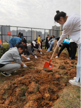 在植树节活动现场,最吸引人眼球的是公司的员工志愿者们,我们没有采取其他院的分块承包办法,而是齐心协力、集体作战,一排男生在前挖土翻地,一排女生在后除杂草草根,成为活动现场最靓丽的风景线。