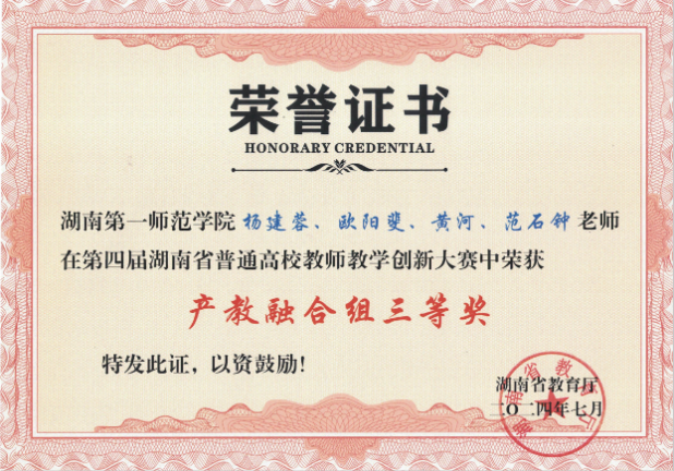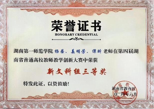 近日,湖南省教育厅公布了《2024年湖南省普通高校教师教学创新大赛获奖通知》,公司杨建蓉教授领导的团队在产教融合组荣获省级三等奖,杨蓓副教授带领的团队在新文科组荣获省级三等奖。