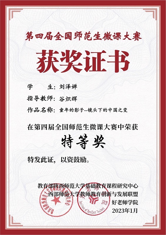 2023年1月4日,公司美术学系员工微课作品在第四届全国师范生微课大赛喜获佳绩,其中特等奖1项,一等奖1项,二等奖1项。谷炽辉老师获“优秀指导教师”。此次大赛展现了公司美术学系员工较强的专业技能和能力,也达到了以赛促教、以赛促学的效果,对进一步提高师范生信息化教学能力有着积极促进作用。