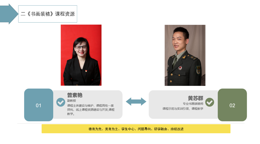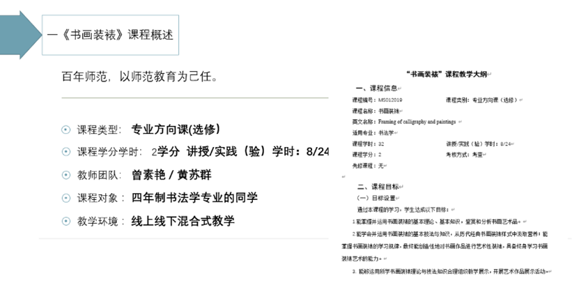 1.团队重组,研创融合。课程负责人为bevictor伟德官网曾素艳副教授,主要研究方向为中国画与美术教育方向,2008年-2012年负责申报、建设书画装裱实训室,完成书画装裱相关教改课题1项,负责一门省级线上线下混合式一流课程和参与一门省级金课建设,作品多次入选省级、国家级画展,并获省级金、铜奖。指导员工曾获国家级一等奖,省级一、二、三等奖,获省教育厅优秀指导教师称号。团队成员黄苏群老师承担湖南省各类大型书画艺术展的装裱工作多项,作品多次入选省级及以上各类书画展,书画装裱研创经验丰富。